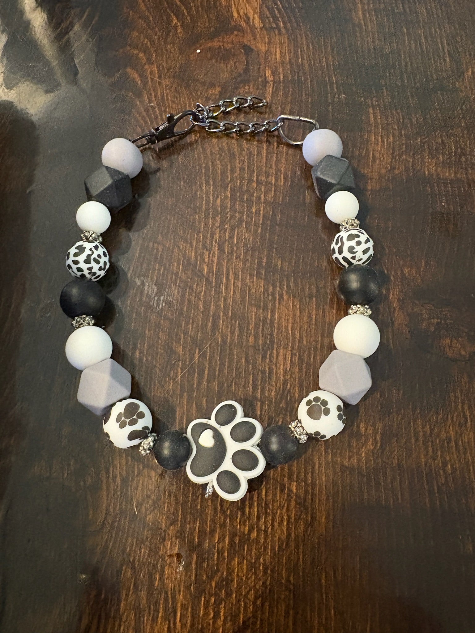 This handmade collar is all about clean lines, timeless neutrals, and a little sparkle in every step. With paw print details and a bold charm centerpiece, it’s the perfect match for classy pups and cool cats alike. 🐾✨